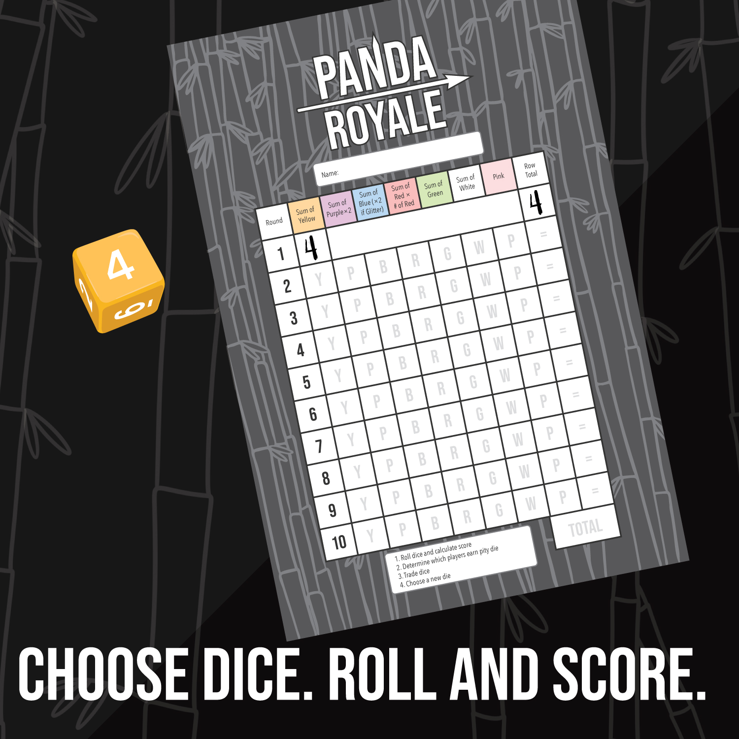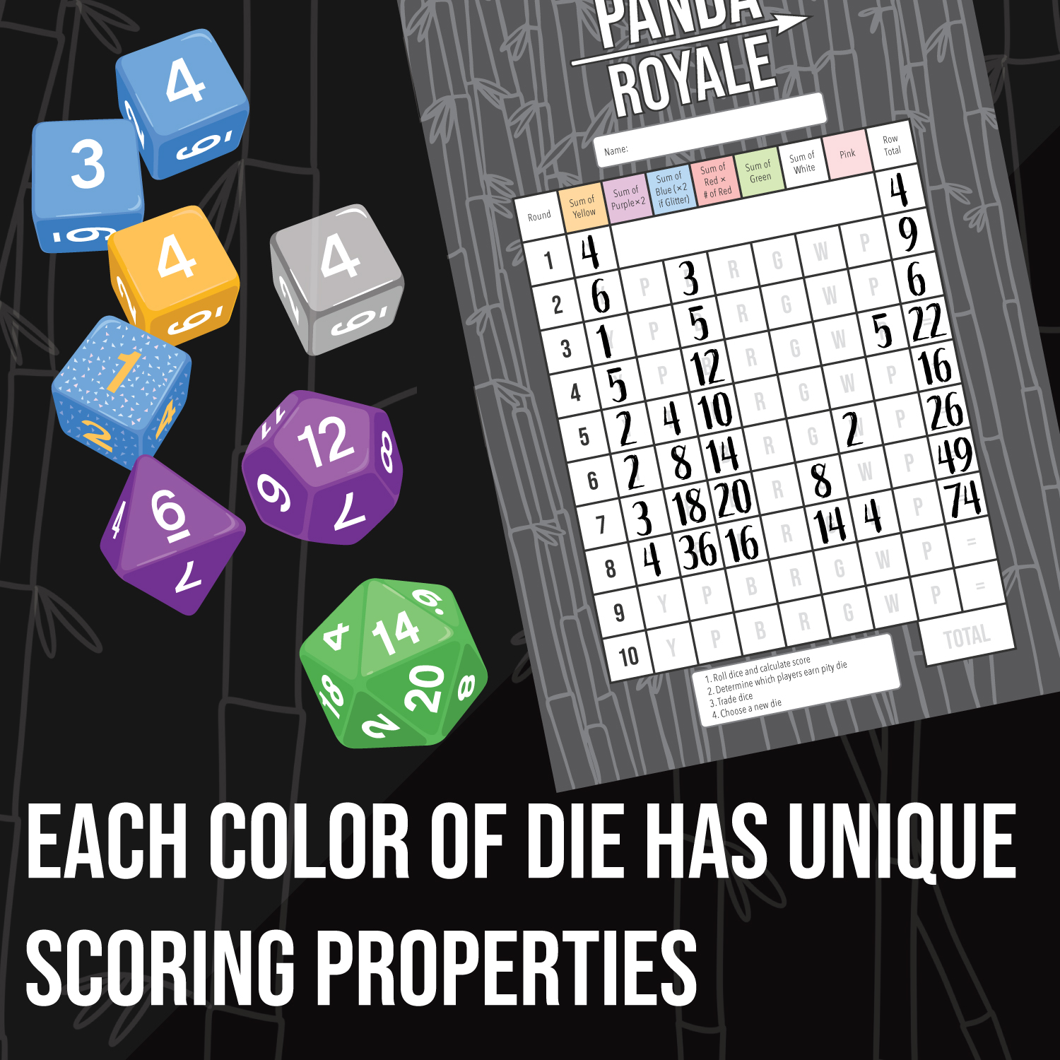 Panda Royale is an energetic dice drafting game for 2-10 players. With over 100 gorgeous dice in the box. During 10 rounds you will add new dice to your team to compete for the highest score. Each color of dice has special abilities, so you must choose wisely.