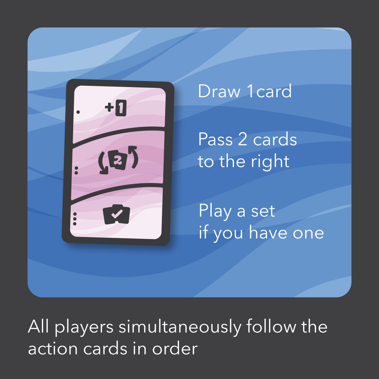 One to Five is a high energy game that will have you laying down sets of cards from 1 to 5, (5 fives, 4 fours, 3 threes, etc). The first player to lay down all 5 sets wins. The deck of Action Cards determine what all players will do in each round. You might draw a card, play a set, then pass a card to the right. Or you might draw exactly the card you need but have to pass your whole hand to the left before you get a chance to play your completed set! Every game is different, exciting and unpredictable. One to Five will have your whole table laughing, wanting to play again and again.