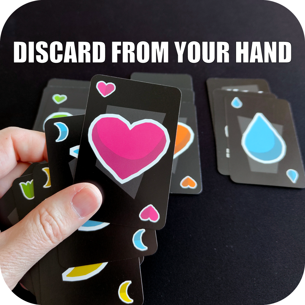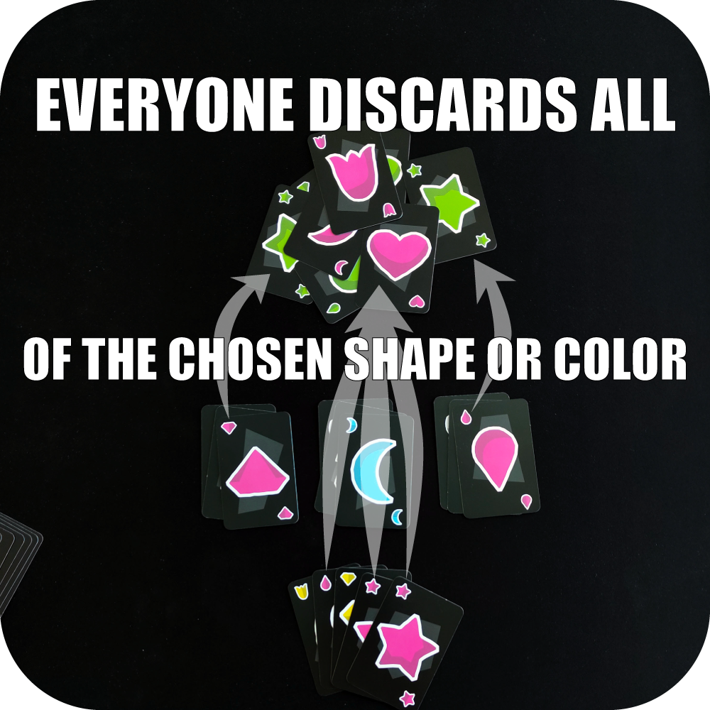 In this fast and easy to learn card game, you’ll try to get rid of all your cards before everyone else. On your turn you will simply call out a shape or color and discard all of your cards that match. But watch out, all your opponents can also discard their matching cards. Some of your cards are held private in your hand, but others are face up on the table for everyone to see. You’ll need to pay attention to everyone else’s cards, remember what they discard, and have a bit of luck to run out of cards first.
